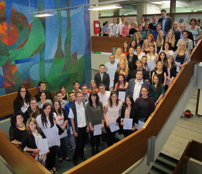 Im Anschluss an die Reden und Grußworte verliehen Studiendirektor Raimund Scelle und die Klassenlehrer die Urkunden für die Lob- und Preisträger und die Abschlussfeier klang mit einem kleinen Umtrunk für die Jungkaufleute aus.