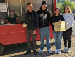 Döner im eigenen Wachstuch gibt es schon in ganz Künzelsau. Die Stadt Künzelsau hat bereits 13 Läden und Stände auf dem Wochenmarkt, wo Einkaufen mit eigenen Stoffbeuteln möglich ist. Diese Stände sind mit einem Sticker gekennzeichnet. Es wäre toll, wenn auch ihr an der Schule mitmachen würdet, damit wir unnötigen Müll sparen.
